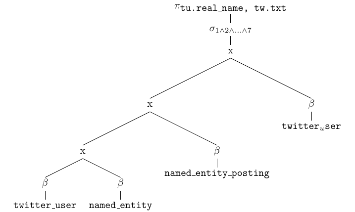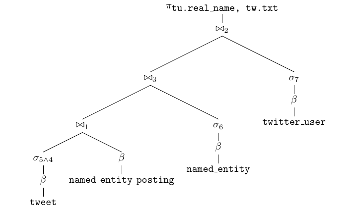 Der Operatorbaum i.A. aehnlich zu dem Operatorbaum aus 4), in dem Sinne das 1. Die Selektionen ebenfalls nach unten geschoben wurden und immer vor den join-Operationen stehen. Denn wir haben hier ausserdem keine Krezuprodukte, sondern 2. alle Kreuzprodukte wurden durch joins ersetzt.